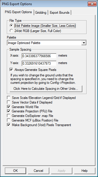 When selected, the command displays the PNG Export Options dialog which allows the user to setup the export. The dialog consists of an Options panel (pictured below), which allows the user to select whether to export an 8-bit palette-based PNG or a 24-bit RGB PNG file, as well as other applicable options, a Tiling panel, and an Export Bounds panel which allows the user to set up the portion of the loaded data they wish to export.
