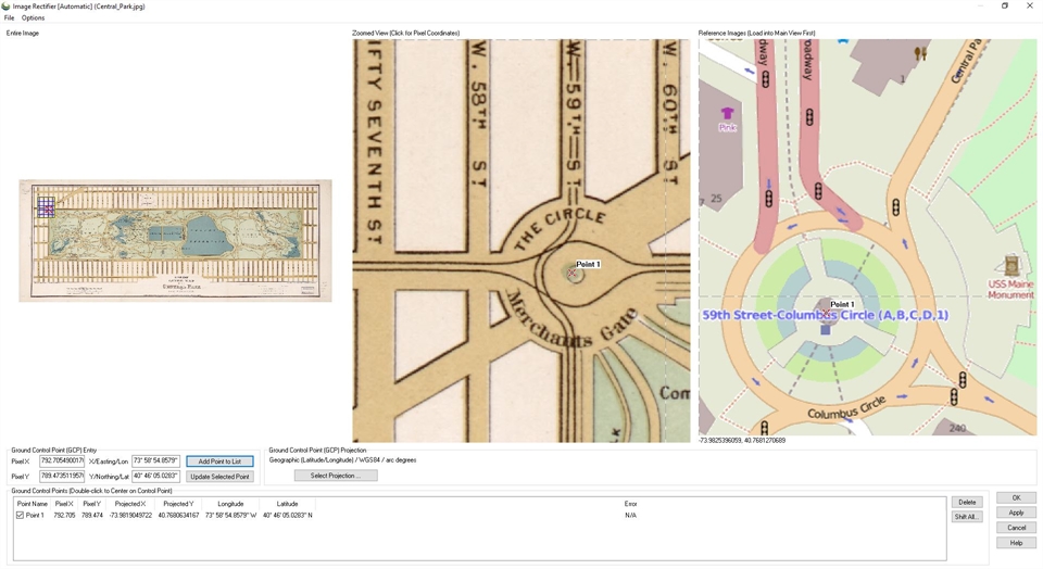 Choosing Add Point to List confirms the values as a control point. The point will not be used for rectification until added to the list. This allows for fine-tuning of the positions.
