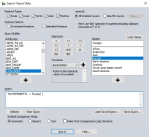 To build a search query, type the query into the search box, or use the Query Builder attributes, operators, functions and values to build the query expression. Like other scripting syntax in Global Mapper, the attribute names, operators and functions are not case sensitive.