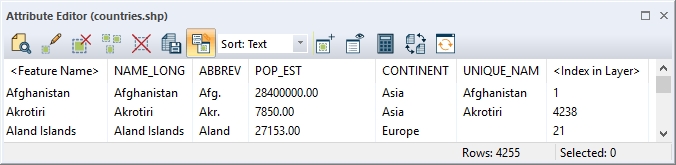 The following samples use the default Countries data, which is loaded when pressing the Load Default Data button on the application start screen. The below table displays a subset of the relevant attributes and features.