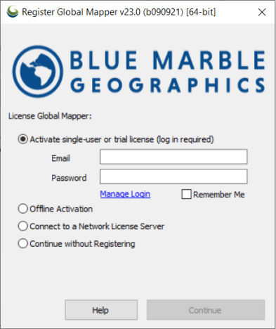When an unlicensed version of Global Mapper opens the registration screen will appear. Several registration options will appear to choose from; the Activate single-user or trial license option is selected by default. Select the applicable option based on your Global Mapper license type.