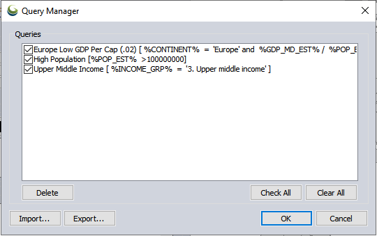 Export – Use the Export options to save a set of queries to a *.gm_query file. This can be shared with another user, or later reloaded in another workspace. All checked queries will be included in the export. Use the Check All or Clear All button to help make the proper selection for export.