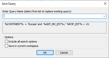 Include all search options – Check this option to include other parts of the query dialog settings beyond just the query statement. This includes the settings under Feature Types, Layers, Feature Options, and Default Comparison mode.