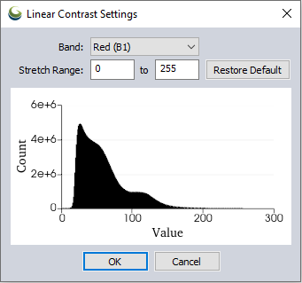 This method allows you to set the specific stretch range for each band of an image. The set range of values will then be stretched to the range of 0 to 255. Click Setup... after selecting this method to view a histogram for each band, and set the custom stretch range. Select each band from the Band dropdown and enter the lower and upper limits for the stretch range. Any bands that you do not specify a custom range for will stretch to the full min/max range of values in that band, as if the the Linear (Minimum / Maximum) stretch option was used for that band.