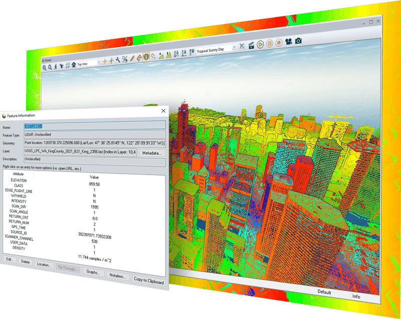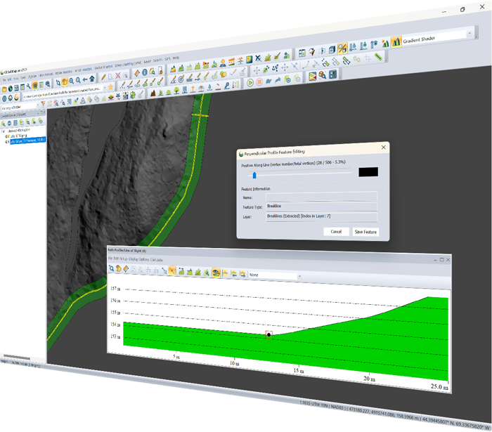 Docked windows supporting top-down 2D, oblique 3D, and cross-sectional data views can be opened, resized, and organized within the Global Mapper display for optimal viewing of any data type. When considering 3D data, configurable color-ramp shaders can be applied to inform elevation or slope values in the 2D or dynamic 3D views. Additionally, the 3D viewer supports the recording of HD fly-through videos allowing users to export a visual exploration of point cloud, elevation, draped raster data, and vector data in an easily sharable video format.