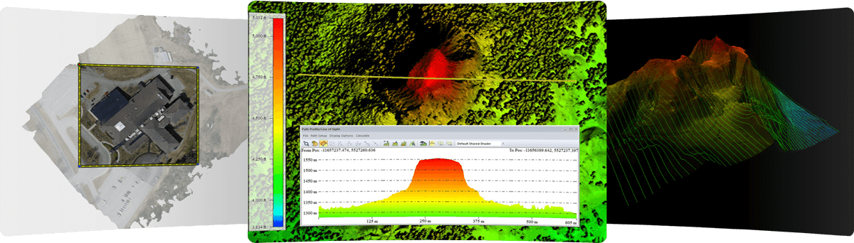 With tools for applying colorful shaders for 2D and 3D data Global Mapper’s dynamic terrain visualization supports imported elevation data imported and TIN layers generated from 3D vector data. Cross-sections profile views of terrain data can be created from any existing or drawn linear feature on the map. Profiles can be used to calculate elevation statistics and slope along a given path and line-of-sight analysis options can be used to visualize any obstructions that may interfere with the view along the path. Combining data views, visualization option allows the Path Profile display to be rendered as a terrain cutaway in the 3D View.