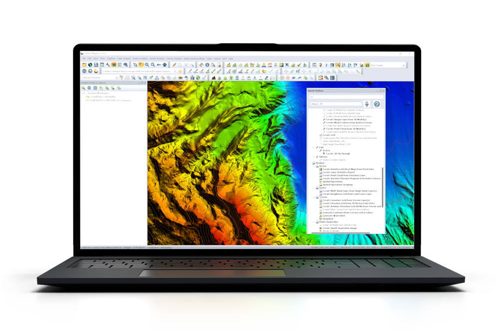 Global Mapper Pro® expands upon the extensive functionality of the standard version of the application for those with advanced workflows. It includes all features available in the standard version plus lidar/point cloud creation, classification, and analysis; advanced image, terrain, and vector editing and analysis; and scripting support for workflow automation.