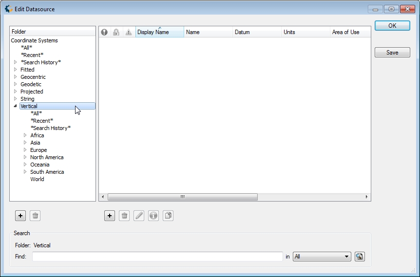The Edit Datasource dialog allows you to add, change and delete user-defined Vertical References, and to view all Vertical References.