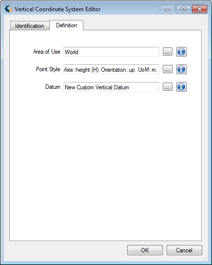 In the right-hand pane, right-click and select New Object or click the Add button below the pane. A new blank Vertical Coordinate System Editor dialog will open. There are two tabs on the Vertical Coordinate System Editor: