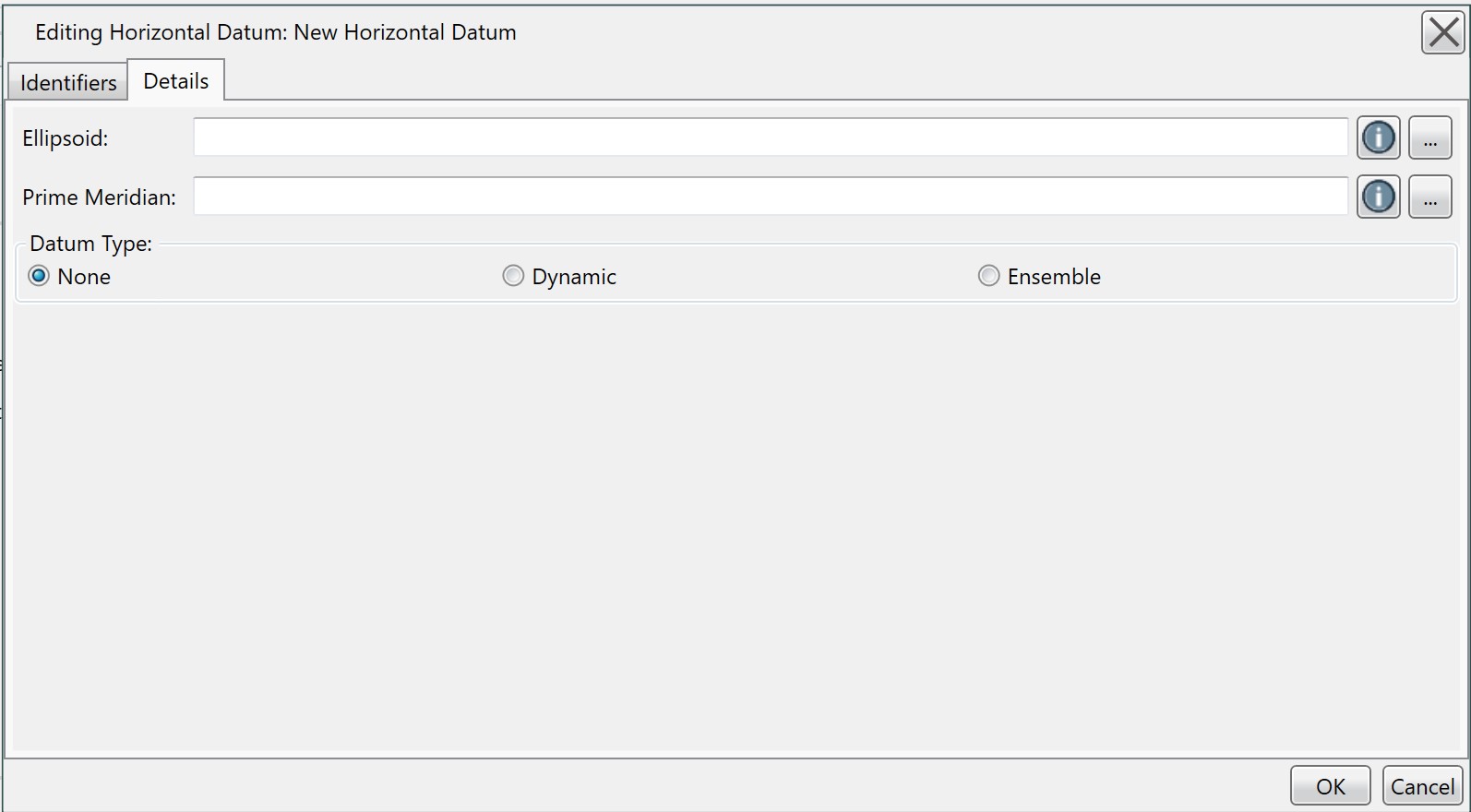 DetailsThe Details tab is used to define the object's parameters. For Horizontal Datums you must select the ellipsoid the datum is based on, as well as the prime meridian used. Vertical Datums have only the Datum Type definition.   Datum Type: Choose to specify whether the datum definition is Dynamic or Ensemble. None is the default selection if neither one is specified. - Dynamic A system that has a dynamic reference frame. This means the position of points may change over time, usually due to crustal deformations such as tectonic motion and glacial isostatic adjustment. A dataset tied to a dynamic coordinate reference system should include epoch information (date).: Allows you to choose a Frame Reference Epoch to include time evolution in the definition. This is the starting epoch for the datum. A system that has a dynamic reference frame. This means the position of points may change over time, usually due to crustal deformations such as tectonic motion and glacial isostatic adjustment. A dataset tied to a dynamic coordinate reference system should include epoch information (date).: Allows you to choose a Frame Reference Epoch to include time evolution in the definition. This is the starting epoch for the datum.