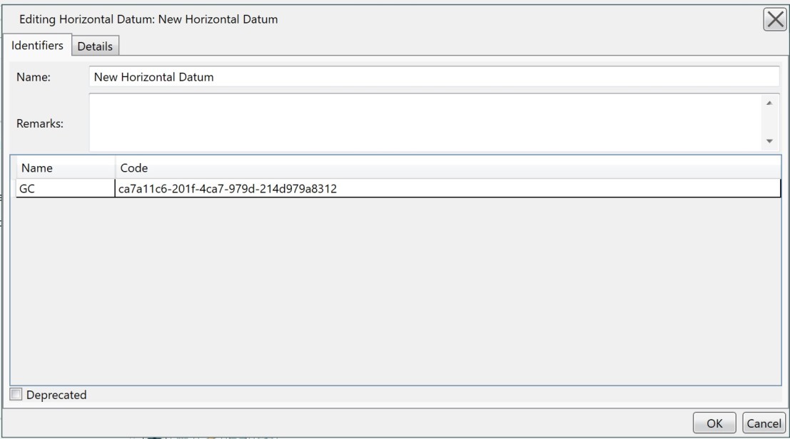 With the Horizontal Datum folder selected, right-click in the right-hand pane and select New Object, or click the Add (+) button below the pane. A new blank Horizontal Datum Editor dialog will open. To create a new Vertical Datum, do the same, but with the Vertical Datum folder selected. There are two tabs on both the Horizontal and the Vertical Datum Editor: IdentificationThe Identification tab is used to name the object and associate identifying codes with it (if applicable).