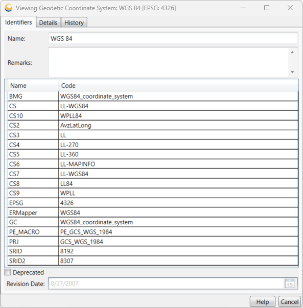 The Identification tab (below) contains fields with coordinate system name, pertinent remarks and other identifiers used for the system. At the bottom of the window is the last revision date for the selected system.