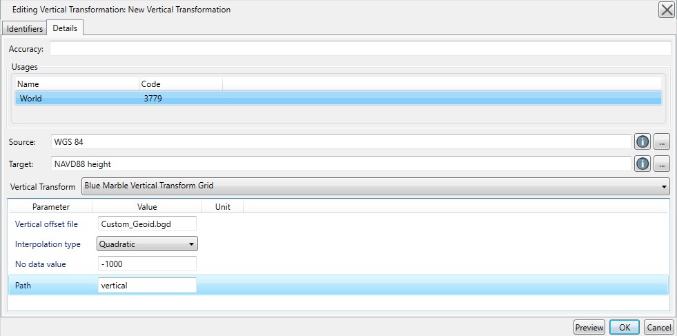 Single Transformations additionally specify a method appropriate to their type. For adding a new Vertical Transformation using a 'Blue Marble Gridded Data' (.bgd) file the appropriate Method is 'Blue Marble Vertical Transform Grid'.