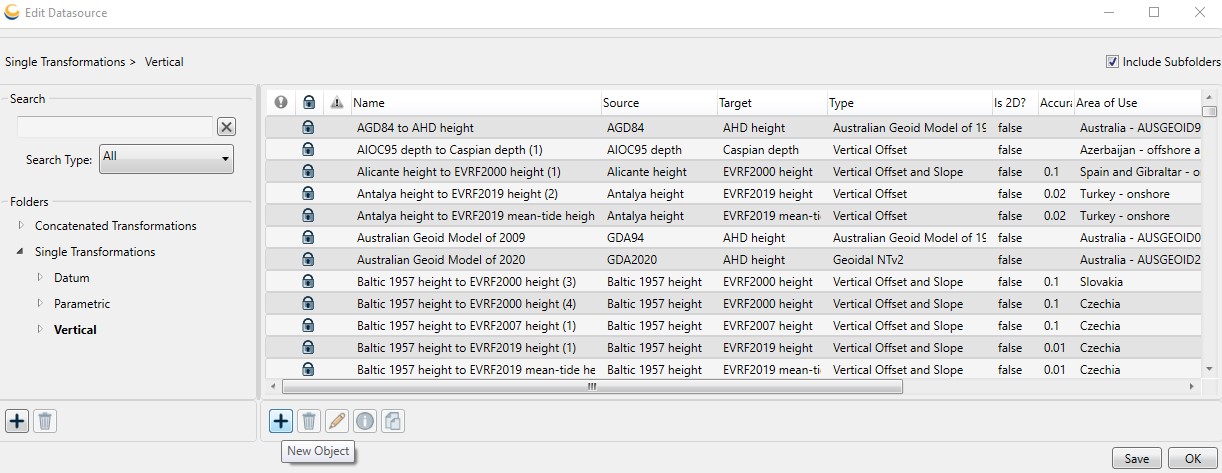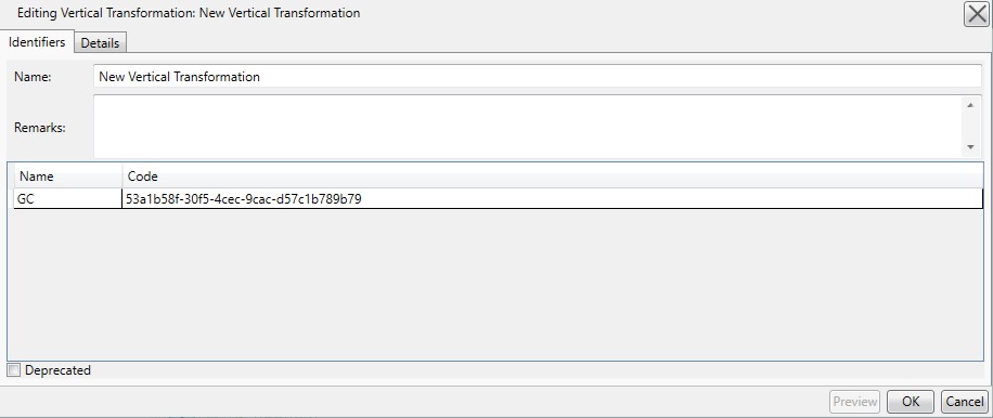 Right -click in the right-hand pane and select New Object, or click the Add (+) button below the pane. A new blank Coordinate Transformation Editor dialog will open, based on the currently selected folder type (Vertical). There are two tabs on all versions of the Coordinate Transformation Editor: