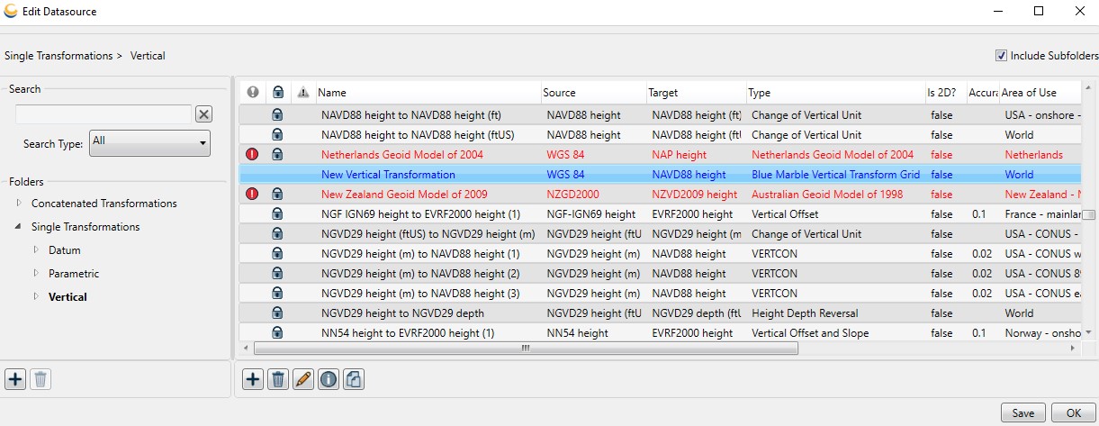 Go to Datasource>Coordinate Transformation Definitions. An Edit Datasource dialog will open. Select the 'Vertical' folder on the left.
