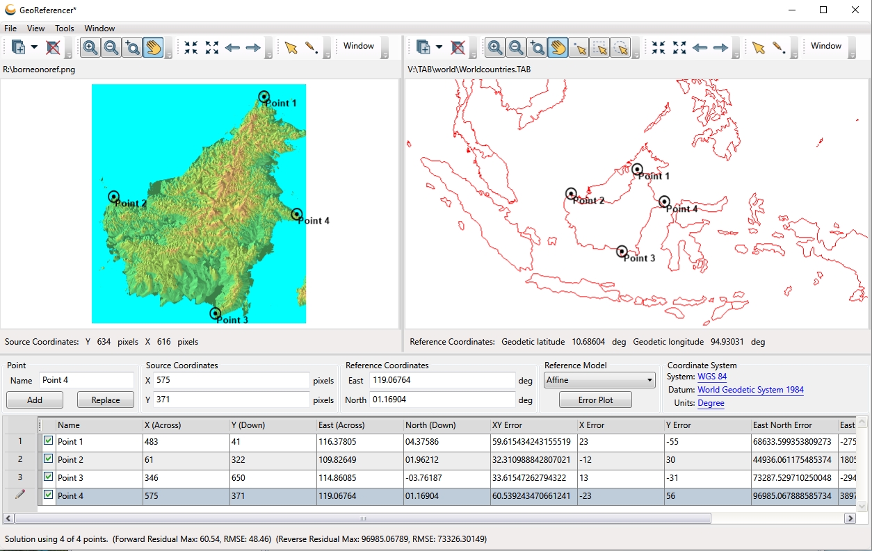 Change the Point Name to Point 2 and locate your next known point. Use the pencil tool to select the point on the image, enter the Reference Coordinates, and click the Add button. Repeat the process for at least three known points. The errors of each point will be shown in the Reference Point List.