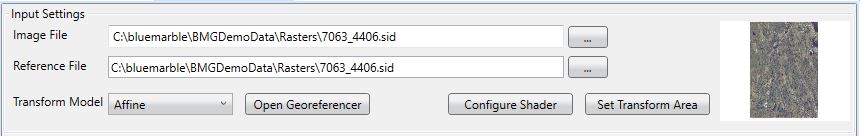 In the Image File field specify the image to be transformed by clicking the Browse(...) button and browse to and select the file. Once specified, a thumbnail of the image will display in the upper right corner of the Transform job panel.