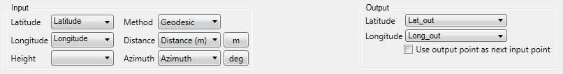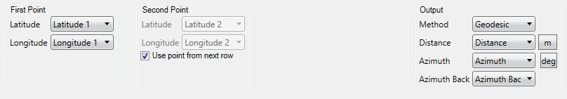 The drop down menus will contain the names of the columns in the table. Using the drop down menus, select the column name that relates to the appropriate data type. If the table was loaded with no column names, default names will be used (C1, C2, etc) in the menus. The Calculator will label the drop down menus according to the coordinate systems that have been set in the Point Database Conversion Job. For example, if you are converting geodetic points (Lat/Long), the text boxes will indicate "Geodetic Latitude" and "Geodetic Longitude". For grid (UTM, State Plane, etc) the labels will indicate "Northing" and "Easting" where appropriate. This is true for both the Input and Output sides of the dialog.InputThe Input settings include drop down boxes for two columns of coordinates. This is because in order to perform an Inverse calculation, there must be two known points for the calculations. Select the columns containing the starting coordinates and the ending coordinates. The Use Input Point From Next Row toggle instructs the Calculator to take the value in the next row (row below) and calculate the inverse (as opposed to using values in another column). Example OutputThe Output settings will vary depending on the chosen Method (Geodesic, Rhumb, or Grid). Note that Grid is only available when using a Projected coordinate reference system. Method - Geodesic, Rhumb, or GridThe following output columns may be set: Distance Geodetic/Grid Distance between the 2 points