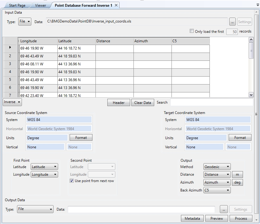 Use the First Point, Second Point, and Output sections to set the columns for input and output. In the Inverse dialog the columns setup is split in half with the Input settings on the left side and the Output settings on the right side.