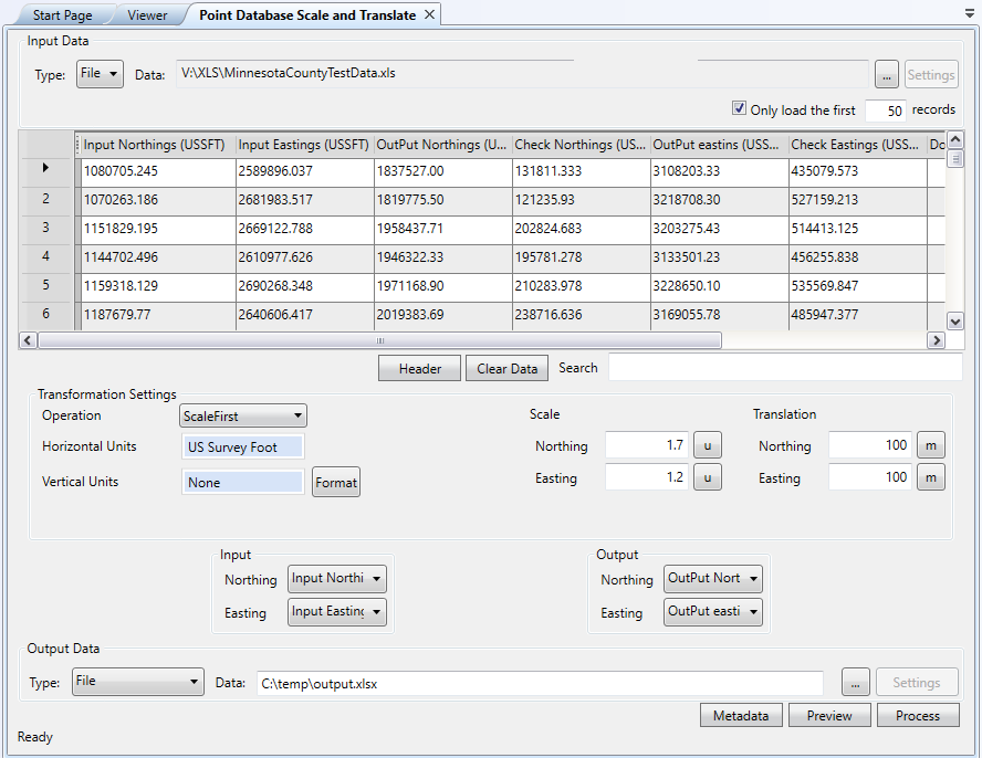 The Point Database Scale and Translate job supports manually specified transformations with Scale, Translation, and Rotation parameters. These are sometimes used in the absence of projection, or other non geodetically-based transformations. This tool is designed to be used with projected coordinates or local survey grid data. To perform a scale and translate operation on a point database file you will need to: