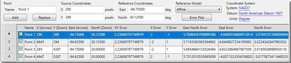 To add a reference point to the list, specify a Point Name, the Source X and Y pixel values (manually or using the Source Image Viewer), and the Reference East and North coordinate values (manually or using the Reference Image Viewer). Once all values have been specified, click the Add button and the point will be added to the bottom of the list.