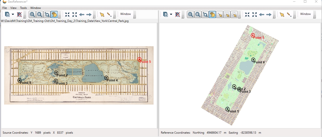 points within the source image to be georeferenced. The bar at the bottom of the viewer displays the current location of the