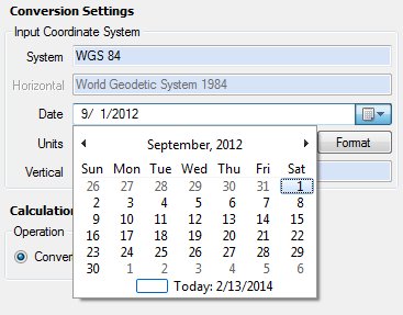 By default, date fields will be enabled for all coordinate system definitions. This setting can be changed within the Preferences Menu. When the date field is enabled, click on it to select a date: