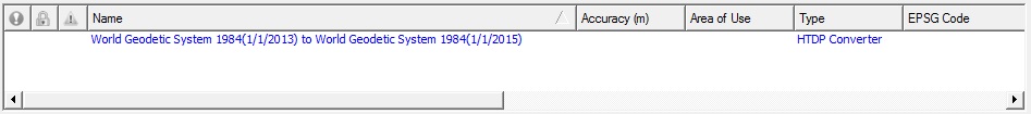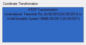 In the case of HTDP selection: If both the source and target coordinate systems do support HTDP, and have active specified dates, then an HTDP transformation will be created for use by the current calculation. This datum transformation will not be added to the custom datasource and is not viewable in the Datasource dialogs. It is constructed based on the current transformation. The Datum Transformation field will be updated with text describing the transformation.
