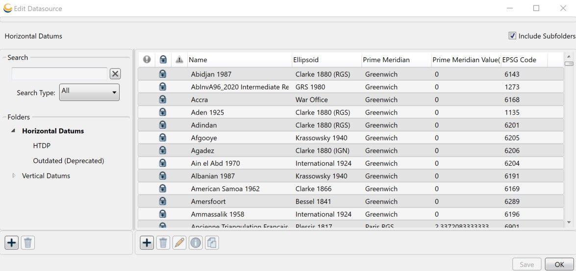 The Edit Datasource dialog allows you to add, change and delete user-defined Horizontal Datums, and to view all Horizontal Datums.