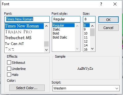 Use the font dialog to specify the desired font. A preview will display in the Sample area of the dialog.