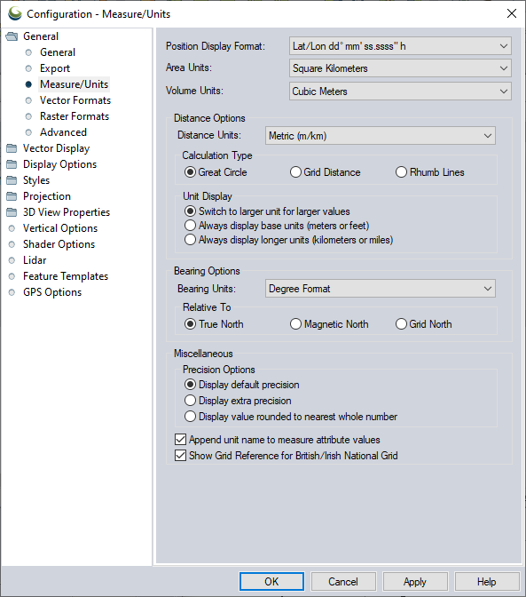 The Measure/ Units section in General Configuration contains settings relative to units and methods used in the Position Display in the bottom bar of the application, in the measure tool, and during feature calculations. Many of these options were previously available in the Measure Tool right click context menu. For vertical units see Vertical Options.