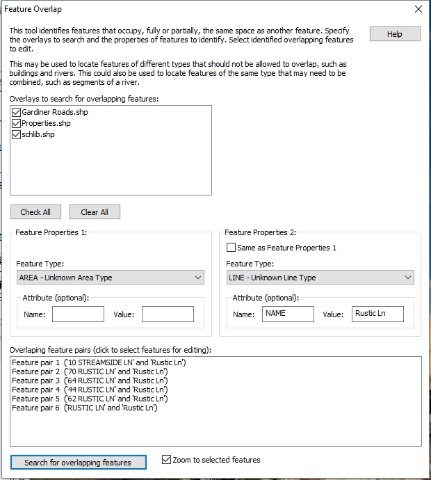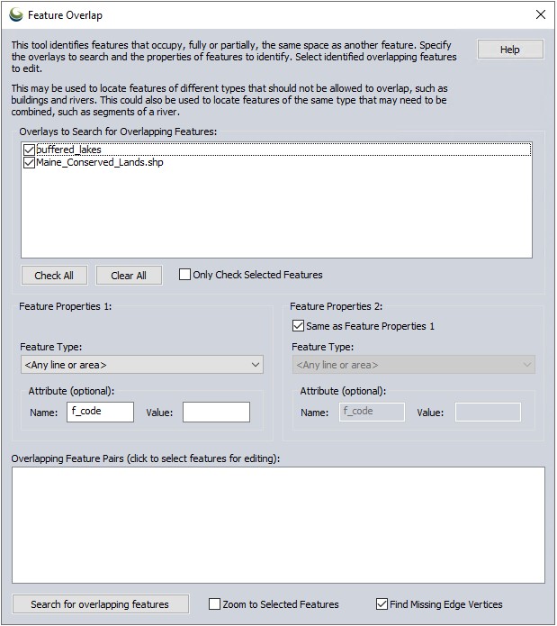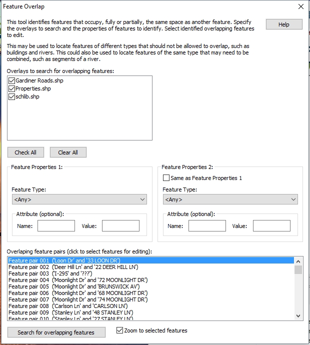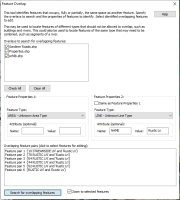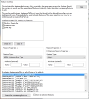 Same as Feature Properties 1– Check this box to search for overlapping features with the same type (and optional attribute). For example, you may wish to find building features that overlap.