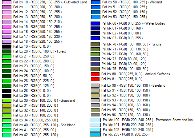 This palette comes from the GlobeLand30 land cover database. For more information see https://www.globallandcover.com/