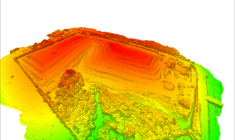 This example shows a point cloud generated from a mesh (3D Model produced by Pixels to Points ®). The second image shows the point cloud gridded into a terrain surface using the Create Elevation Grid from 3D Vector Data tool.