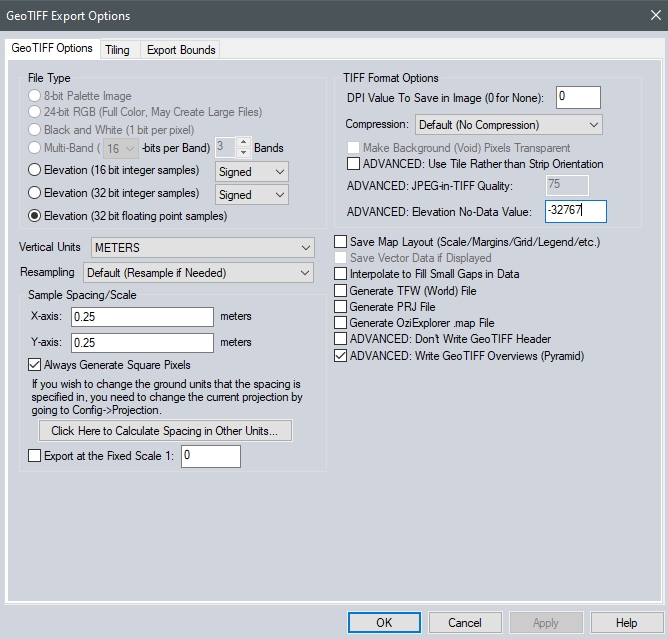 Elevation (32-bit integer samples) - This option generates an elevation GeoTIFF using the currently loaded elevation grid data sets. Elevation samples will be stored as signed 32-bit integers. Check that vertical units are appropriate prior to using this option, intended for use with high resolution, sub-metric elevation data and values.