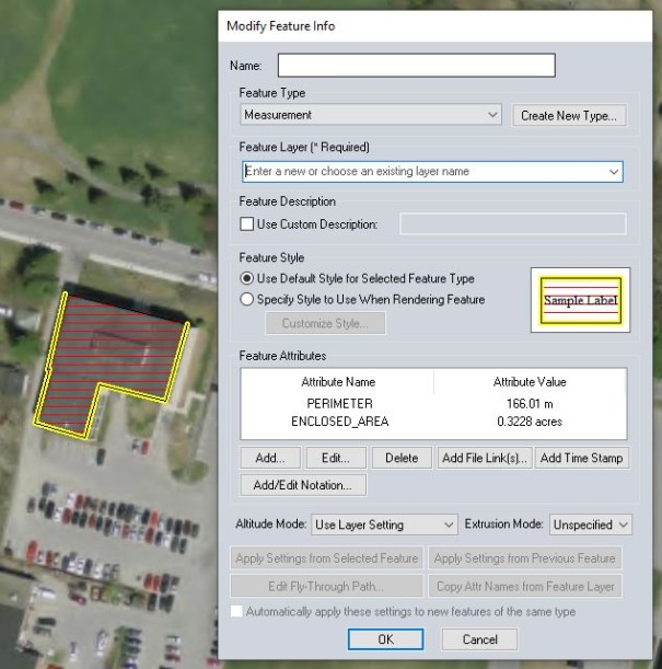 To save a drawn measurement as a feature, right-click and select Save Measurement from the context menu. When prompted, choose to save the measurement as a line or area feature (selecting Yes will create an area feature and selecting No will create a line feature). Populate the needed information in the Modify Feature Info dialog box, and click OK to create the feature.