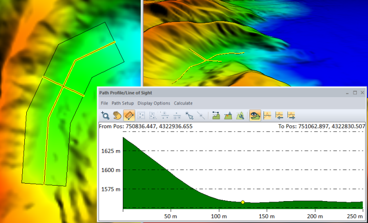 Parallel and Perpendicular Path Profiles are features of the Path Profile tool that provide the ability to look at subsections of the path profile. These additional profiles function similarly to one another, but they are differentiated by their perspectives being either parallel or perpendicular to the original path profile. Only one type of perspective profile can be enabled at a time.