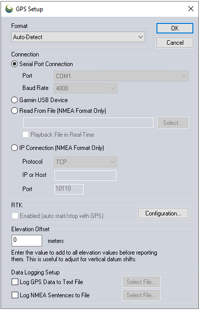 Make sure that you have your GPS device set to NMEA-0183 v2.x or Garmin mode and choose the applicable mode from the Format dropdown menu. Trimble GNSS devices are supported via Bluetooth. The Auto-Detect option directs Global Mapper to automatically determine a GPS device's settings when tracking is started.