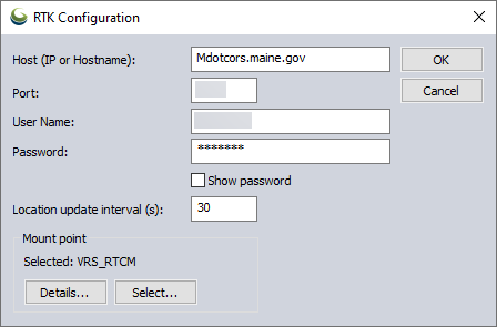 User Name and Password - Use your log in information to connect to the NTRIP caster.