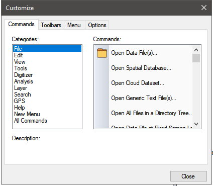 The Commands tab lists all the available options from the menus. Drag a command into a toolbar to add a new button for that command.