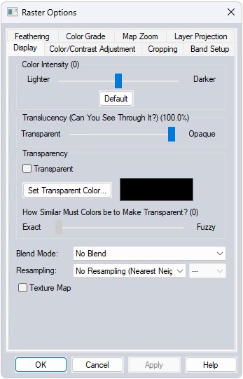 Layer Options toolbar button, or right clicking on the layer name and selecting Options. It will also open when double-clicking on the layer name. The Raster Options and Elevation options dialogs contain a display tab.