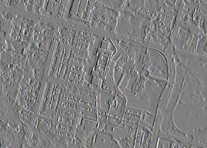 Sobel - Sobel filters are used for edge detection that involves a convolution of 3x3 kernel, for detecting either horizontal or vertical edges by multiplying the corresponding pixel values of the image with the kernel and summing them up. It results in an image where the intensity values of pixels are proportional to the strength of the directional edges in the original image. Edges are visible as extreme high/low values in the generated layer. When used on elevation data the generated layer will display with the gradient shader applied.