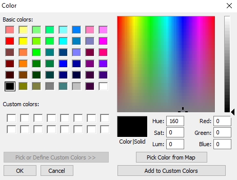 Pick from Table - This option is available for imagery or elevation layers that do not contain a palette. This will display the Color selection dialog. Select a basic color, or use the settings on the right to fine tune the color by Hue, Saturation and Luminosity, or Red Green and Blue values.