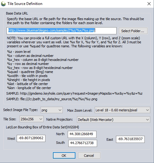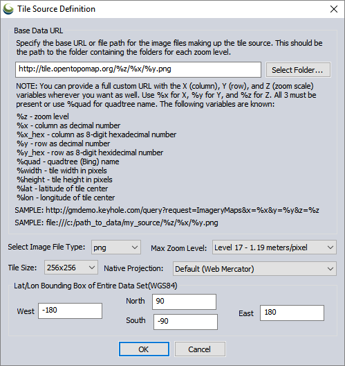 If accessing a source setup similar to Bing Maps tiles, it might be necessary to use the quadtree filename. Use %quad to do this. This replaces the %x, %y, and %z values. Finally the Bing Maps RESTful services supports accessing via the zoom scale (%z) and a latitude and longitude value in the tile. Use %lat and %lon to include the latitude and longitude of the center point of the tile in your custom URL.