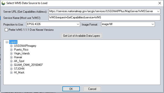 Below is an example WMS connection that connection to the USGS National Map NAIP Plus data. Note the full Get Capabilities url was placed in the server URL field. The tool will separate the URL once the Get List of Available Data Layers button is pressed.