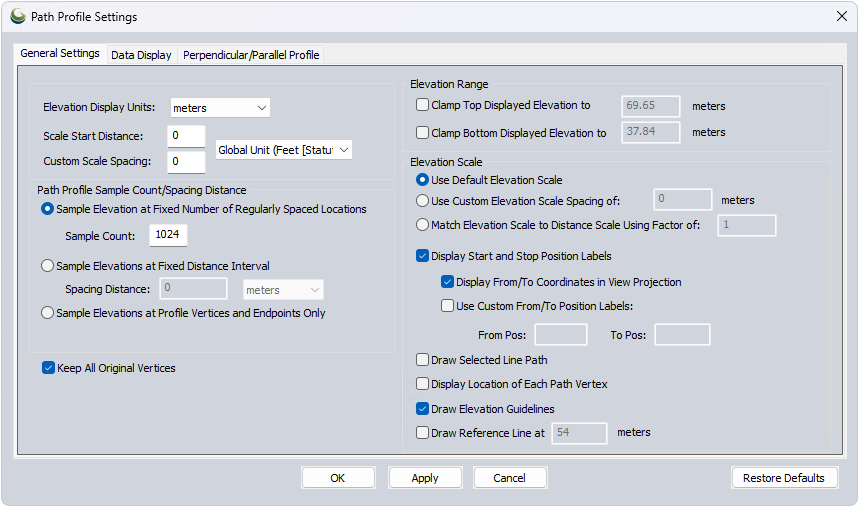 Elevation Display Units controls the units on the Path Profile elevation axis, as well as the other elevation settings used to control the elevation range in the path profile window.