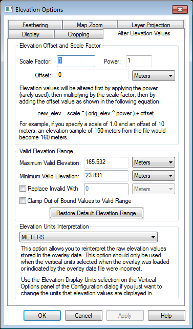 The Alter Elevation Values tab (pictured below) allows the user to modify how elevation values from the selected layer(s) are interpreted, providing you a means to offset all of the elevations in the layer(s) by a given value and to restrict the range of elevation values that are treated as valid.