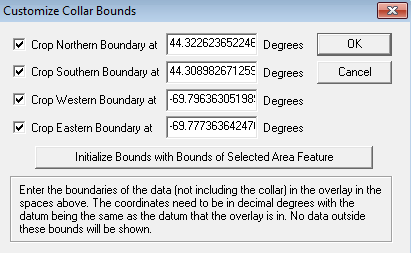 The option allows specifying a crop boundary in the native units of the selected overlay. When selected, this option will display the Customize Collar Bounds dialog (pictured above) to allow specifying the bounds to crop to.