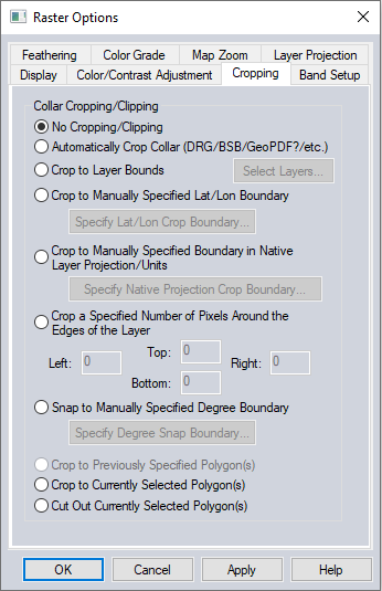 The Cropping tab (pictured below) allows you to crop the selected overlay(s) to a particular boundary, including support for automatically removing the collars from USGS DRG topographic maps.