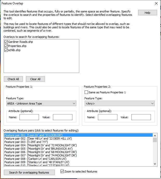 Same as Feature Properties 1– Check this box to search for overlapping features with the same type (and optional attribute). For example, you may wish to find building features that overlap.